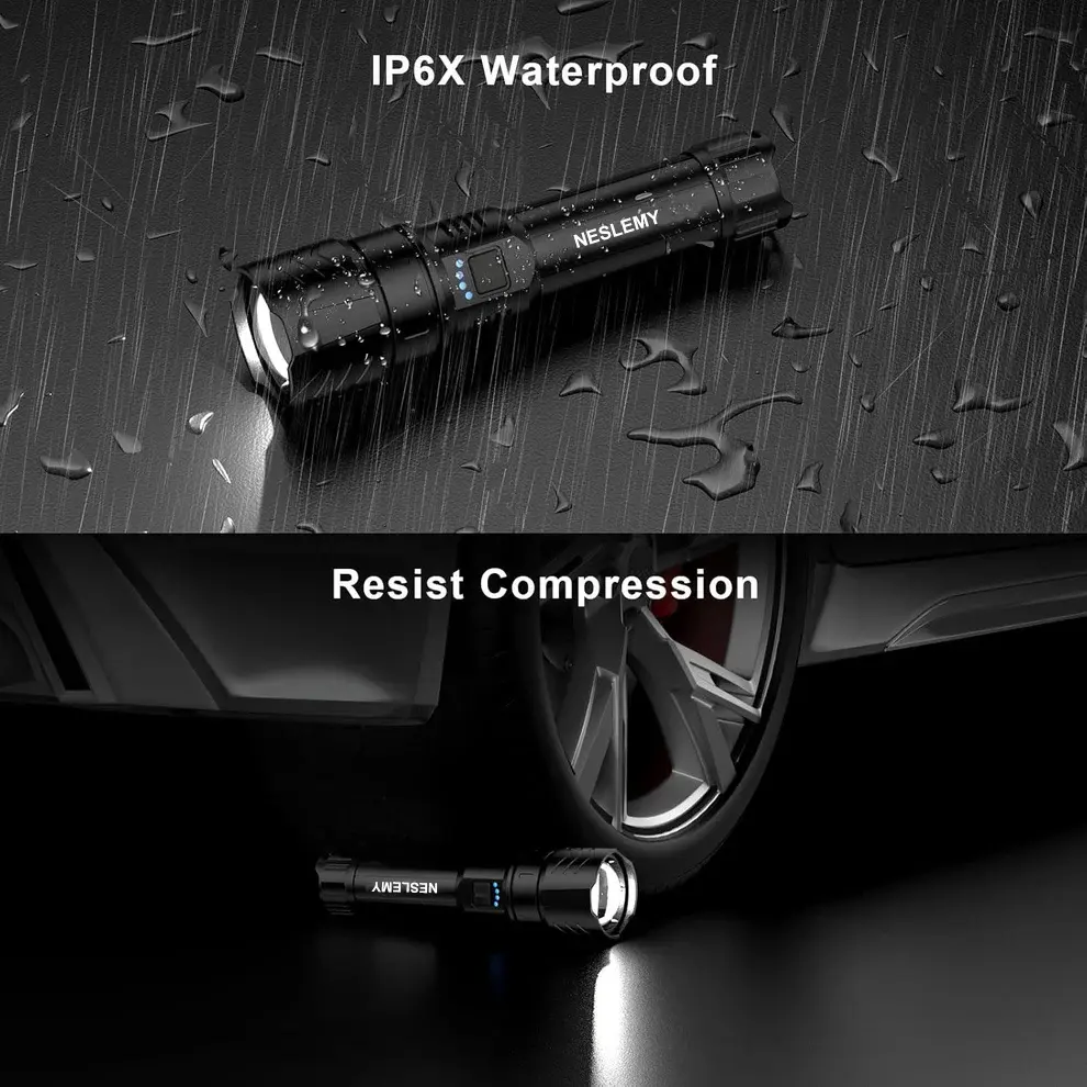 Made from high-quality aluminum alloy, the NESLEMY™ flashlight withstands drops from up to 1.2 meters and is waterproof IP67.