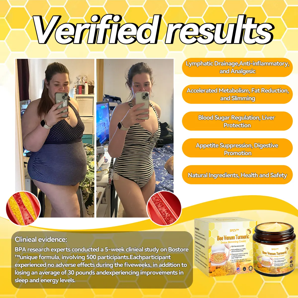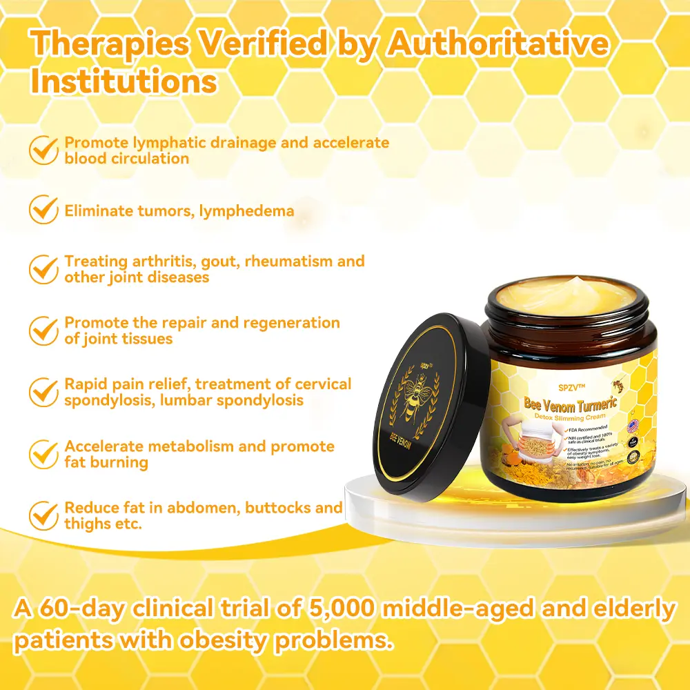 Are you finding it tough to lose weight and seeking a powerful method to refine your body shape? Our SPZV™ Bee Venom Turmeric Detox Slimming Cream is the perfect solution for you! This 100% natural cream serves as an excellent alternative to a variety of weight loss products. In collaboration with leading nutrition and health experts, we have developed a groundbreaking cream that is both safe and non-irritating for all age groups.